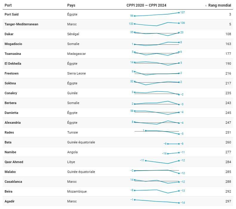 Dans le classement mondial – dans lequel nous avons isolé le palmarès africain dans l’infographie ci-dessous – deux ports du continent tirent leur épingle du jeu: Port-Saïd, en Égypte, et Tanger-Med, au Maroc, qui se classent respectivement au 3e et 5e rang. Signe que les défis sont encore nombreux, le port de Dakar, en troisième position sur le podium continental, n’est qu’au 108e rang mondial.