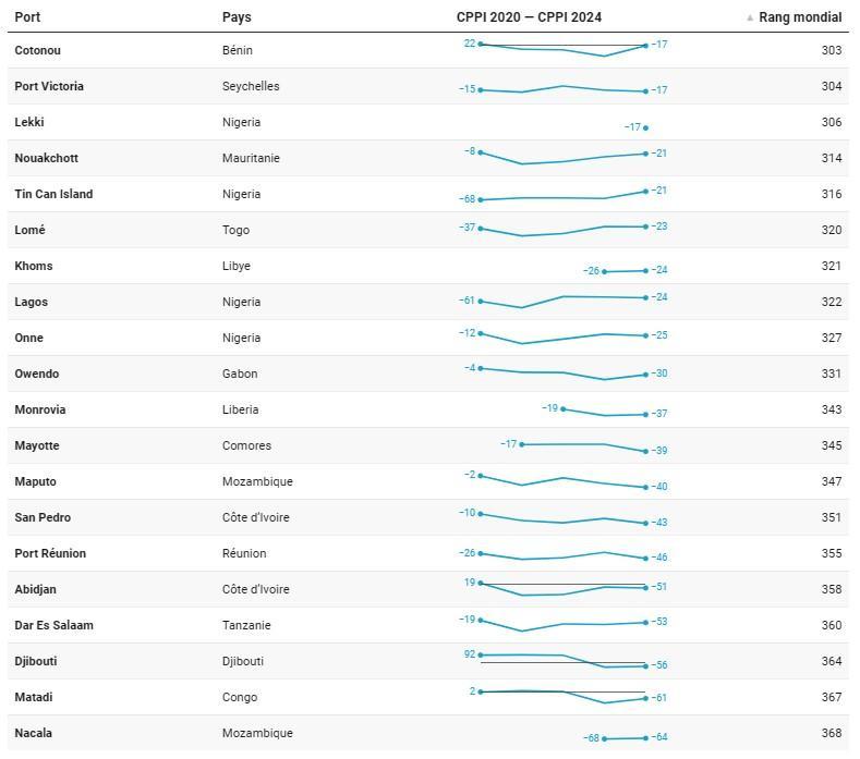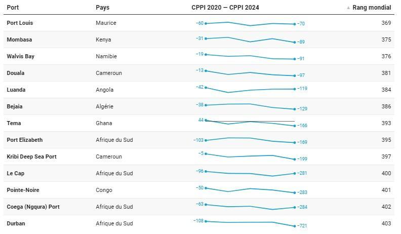 Comment les ports africains se portent-ils? En Afrique subsaharienne, les « défis structurels persistants », et en particulier une « automatisation limitée et une connectivité arrière-port faible », couplée aux conséquences de la crise sécuritaire dans la mer Rouge, où les attaques houthies ont fortement perturbé le trafic au cours de l’année 2024, ont eu pour conséquence de freiner les performances de la majeure partie des ports. En Afrique du Nord, les bonnes performances observées par le passé semblent désormais se tasser.