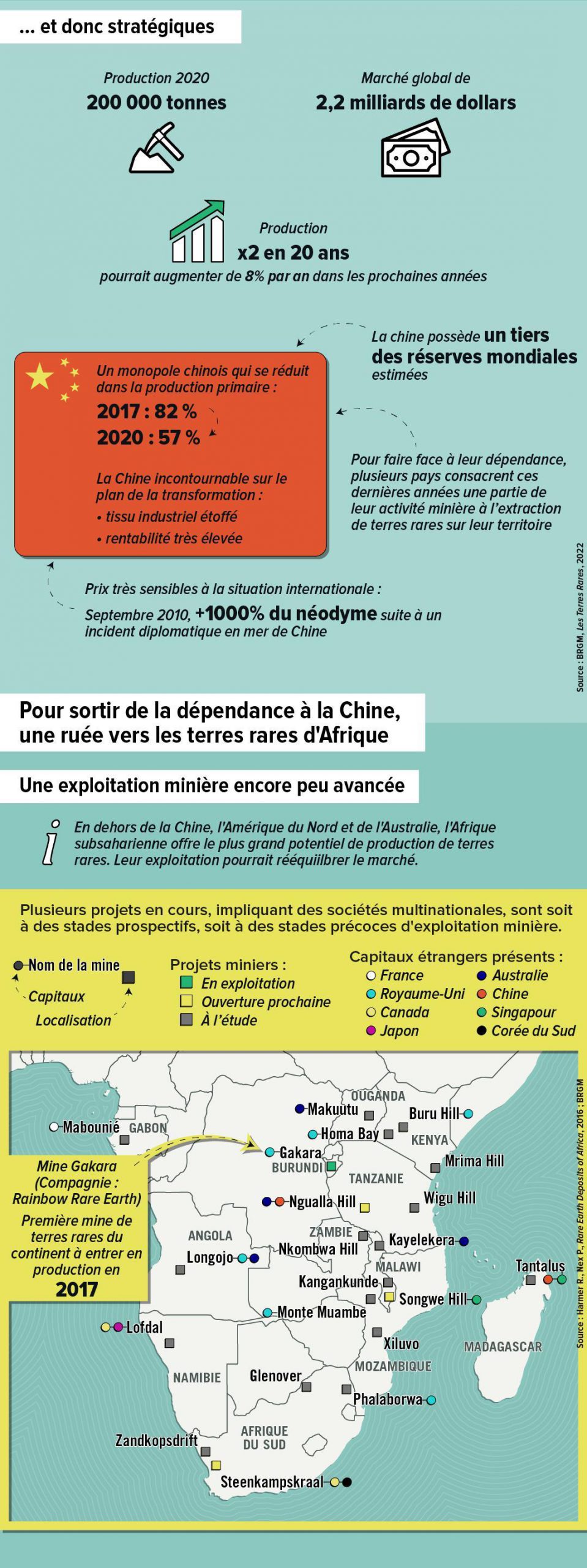 Une situation qui se répète sur la quasi totalité des projets lancés ou en gestation sur le continent. Dans cette course à la mainmise sur les terres rares, l’Afrique est devenue un nouvel eldorado. Mais les populations sont loin de profiter des dividendes et richesses produites par ce nouveau secteur par ailleurs très polluant. Où sont les projets les plus avancés ? Qui les détient ? Comment les décideurs africains peuvent-ils contrecarrer la « malédiction des ressources naturelles » ? Décryptage en cartes et en infographies.