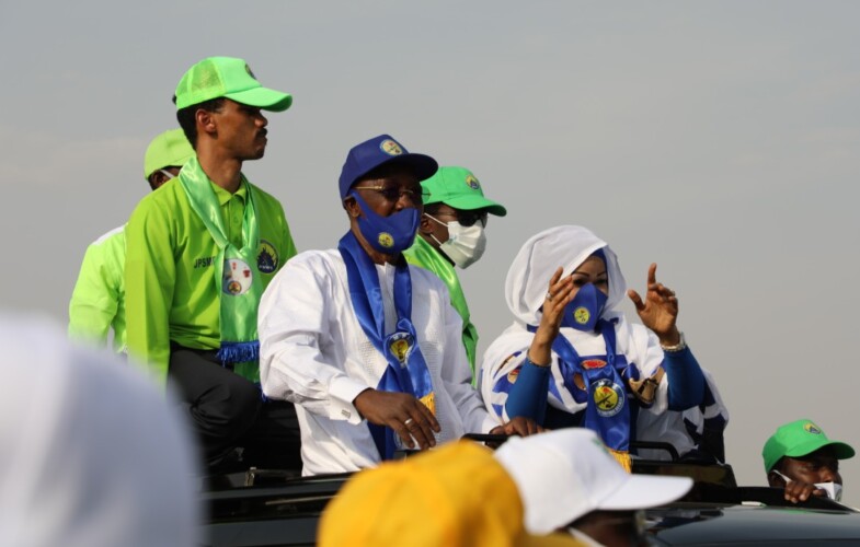 Grand boubou blanc et casquette bleue aux couleurs du MPS, Idriss Déby Itno, accompagné de son épouse, arrive à 16h 04 au Stade Idriss Mahamat Ouya de N’Djamena. Il fait le tour pour saluer la foule à bord de sa voiture. Son cortège fonce à travers les pelouses.