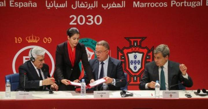 Africa-Press – Tchad. Les présidents des fédérations de football du Maroc, du Portugal et de l’Espagne se sont réunis, samedi, pour signer une lettre confirmant leur intérêt pour la candidature à la Coupe du Monde de la FIFA 2030 et pour partager leur vision du tournoi avec le monde, indique un communiqué conjoint publié par la Federation Royale marocaine de football (FRMF).