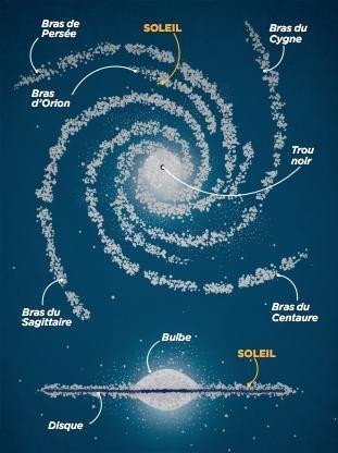 Si on imagine la Voie lactée comme un vaste disque vu de dessus (comme sur l’image ci-dessus): notre Système solaire se situe à environ deux tiers du rayon depuis le centre, sur un petit bras secondaire (le bras d’Orion). En levant les yeux, nous regardons à ras du disque, tantôt vers le centre (Sagittaire), tantôt vers l’extérieur (Orion), mais rarement « au-dessus » ou « en dessous » de la galaxie.
