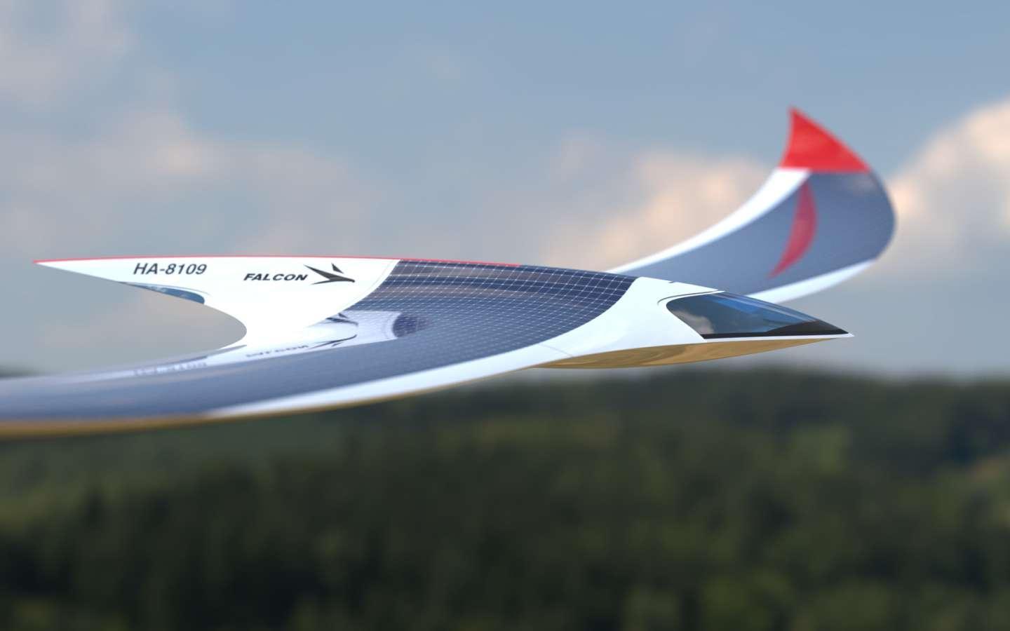 En aviation, on a coutume de dire qu’un avion aux lignes harmonieuses est un avion qui vole bien et justement, le Falcon Solar présenté par la société hongroise Lasko Design est séduisant. Avec sa grande voilure, il a l’allure d’un aéronef futuriste ou d’un oiseau de proie, et il fonctionne à l’aide de l’énergie solaire. S’il ne s’agit que d’un concept, les vues d’artiste de l’aéronef montrent une grande aile dénuée d’éléments mobiles et un fuselage dont la queue élancée est exempte de dérive et d’empennage. L’effet « ailes de rapace » est accentué par la forme du nez de l’appareil et l’incurvation des ailes. Lasko Design ne dissimule d’ailleurs pas ses inspirations biomimétiques.