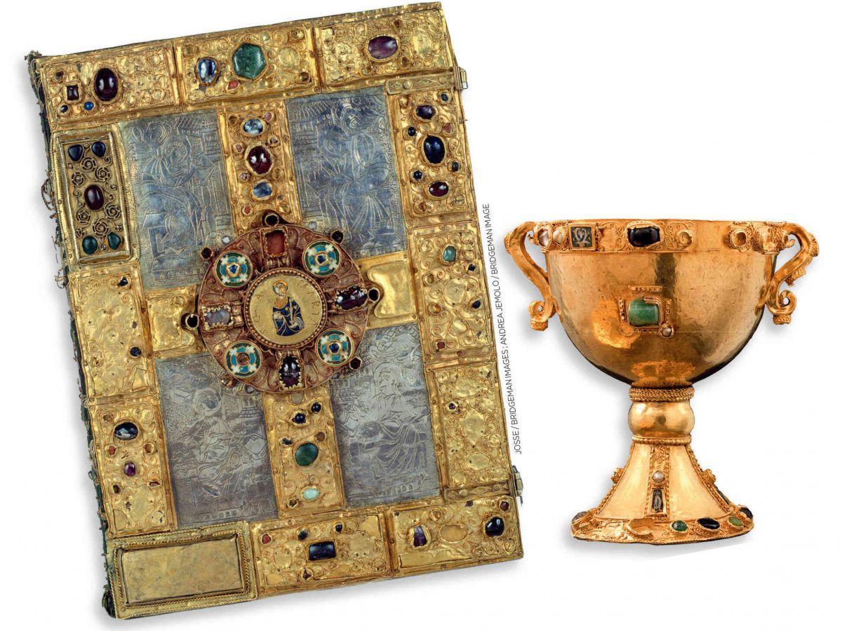 Les artistes lotharingiens vont également maîtriser avec brio la sculpture sur ivoire – qui atteint sans doute le sommet de sa délicatesse avec la plaque de reliure figurant saint Grégoire (voir photo ci-dessous) -, mais aussi l’orfèvrerie, qui joue un rôle majeur dans la glorification divine. Expression par le biais des reliquaires du culte des saints, cet art incarne aussi par son faste la puissance et la richesse de ses commanditaires. On retiendra tout particulièrement le trésor de saint Gauzelin, un ensemble de pièces qui a tout du trésor de roman d’aventures chevaleresque.