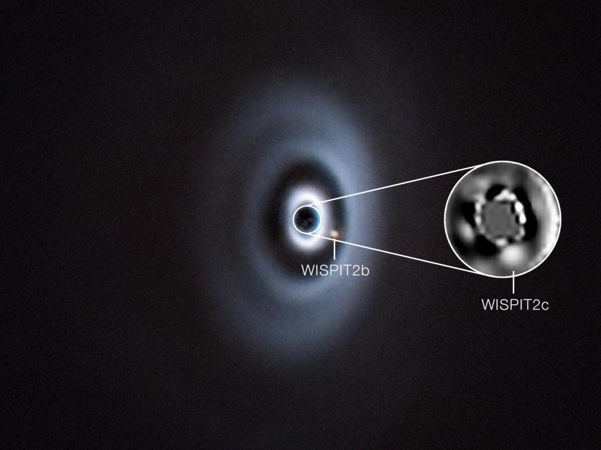A quoi ressemblent ces nouvelles nées? A des géantes gazeuses, mais bien plus imposantes que nos Jupiter et Saturne. WISPIT 2b, découverte en premier, a une masse proche de cinq fois celle de Jupiter. Elle évolue très loin de son étoile, à 8,5 milliards de kilomètres, soit bien au-delà de Pluton dans notre propre système solaire. WISPIT 2c, elle, se situe beaucoup plus près, à environ 2 milliards de kilomètres. Elle est plus massive que sa sœur, entre 8 et 12 fois la masse de Jupiter. Leur « soleil », l’étoile WISPIT 2, est âgée d’à peine 5 millions d’années. Elle est encore entourée d’un vaste disque de gaz et de poussières, structuré en anneaux et en sillons. « Ces structures suggèrent que d’autres planètes sont en train de se former, que nous finirons par détecter », explique dans un communiqué de l’ESO Chloe Lawlor (Université de Galway, Irlande), auteure principale de l’étude.