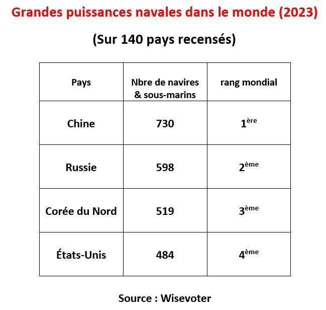 Selon le classement 2023 établi par le site américain spécialisé Wisevoter, la Chine se positionnerait en tête des plus grandes puissances maritimes du monde, devant les États-Unis, la Russie, la Corée du Nord et le Japon ; respectivement deuxième, troisième, quatrième et cinquième dans le classement.