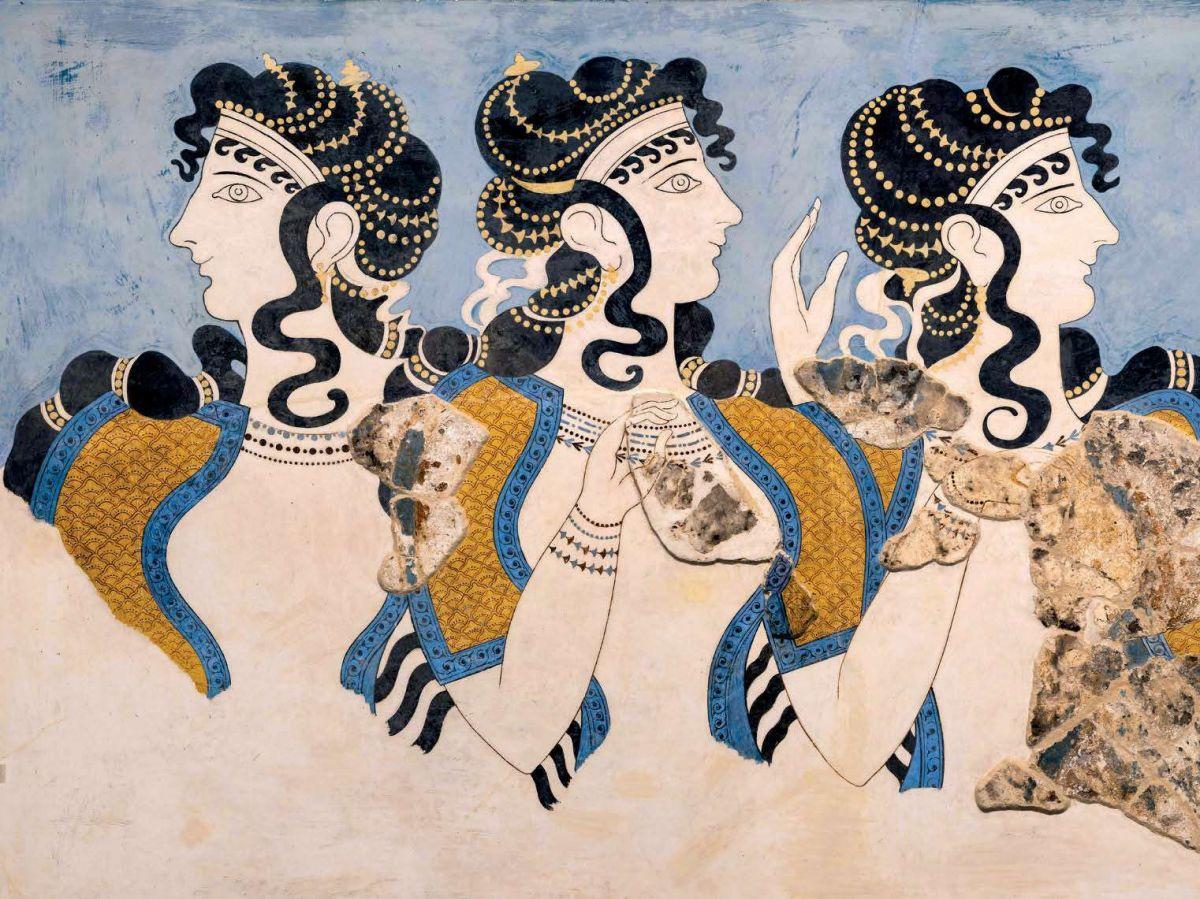 « Toute l’iconographie, des sceaux aux fresques, confirme la primauté de la femme. » Un trait frappant notamment dans les représentations sacrées. « À l’origine, les Minoens pratiquaient une religion de la nature, déposant des offrandes sur des promontoires ou dans des grottes. Mais, à partir de 1650 av. J.-C., apparaissent une ou plusieurs divinités féminines, les seins nus, brandissant des serpents. » Vers 1450 av. J.-C., cette figure sera supplantée par Zeus – signe de l’effacement, au profit des Mycéniens, d’une culture ébranlée par l’éruption volcanique de Santorin, en 1530 av. J.-C., et qui se retrouve minée par un élitisme grandissant.