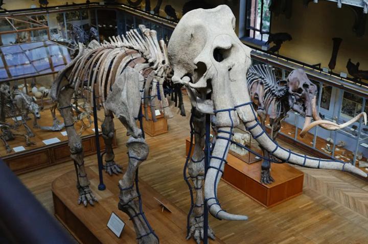 A l’étage de la Galerie de paléontologie et d’anatomie comparée, au-dessus du cortège immobile et silencieux des squelettes de vertébrés, le mammouth domine la salle dédiée aux fossiles, grands et petits. Maintenu dans son corset de fer noir, il en impose jusqu’au diplodocus qui accueille le visiteur.