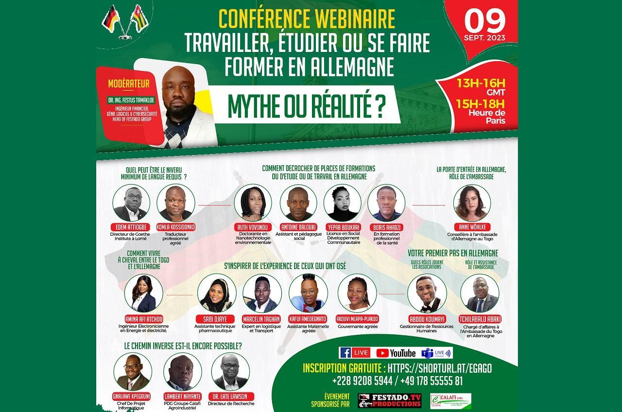 Après la première édition couronnée de succès, les organisateurs ont décidé de rééditer ce cadre virtuel d’échange et de partage d’informations sur les démarches à faire pour voyager en Allemagne et les opportunités d’affaire qui s’y présentent. Placé sous le thème, « travailler, étudier ou se faire former en Allemagne, mythe ou réalité ? », ce webinaire aura lieu le samedi 09 septembre 2023 de 13h00 à 16h00 de Lomé.