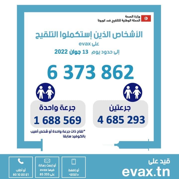 أفريقيا برس – تونس. بلغ عدد الأشخاص الذين استكملوا تلقيحهم ضد فيروس كورونا المستجد، إلى غاية 13 جوان الجاري، 6 مليون و373 ألفا و862 شخصا، وفق ما أفادت به، اليوم الثلاثاء، وزارة الصحة، في آخر تحيين للمعطيات الاحصائية المتعلقة بانتشار كوفيد 19 في تونس، نشرته على صفحتها الرسمية على شبكة التواصل الاجتماعي ” فايسبوك”.