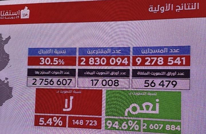 وبلغت نسبة التصويت على “نعم” للموافقة على الدستور الجديد أكثر من 94 بالمئة، مقابل 5.4 بالمئة من الأصوات ضد، وهي أرقام اعتبرها مختصون أنها نسبة ضعيفة جدا وليس لها أية مشروعية حتى تشرع للدستور الجديد الذي قاطع التصويت عليه أكثر من 70 بالمئة من التونسيين.