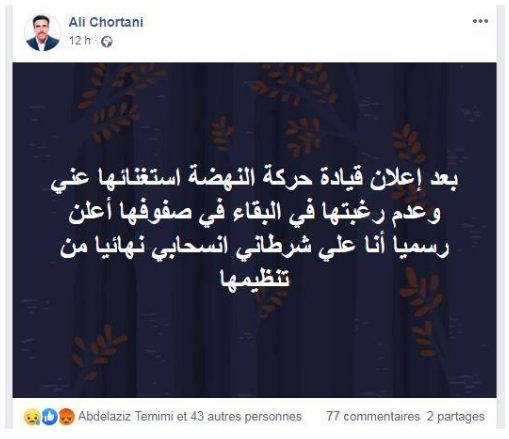 ونشر الشرطاني تدوينة على صفحته الرسمية بالفايسبوك قال فيها “بعد إعلان قيادة حركة النهضة استغنائها عني، وعدم رغبتها البقاء في صفوفها، أعلن رسميا أنا علي الشرطاني انسحابي نهائيا من التنظيم”.