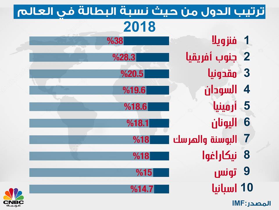 وحسب هذا الرسم فقد احتلّت تونس المرتبة التاسعة عالميا والثانية عربيا بنسبة بطالة تقدّر ب15 بالمائة في حين احتلت فنزويلا الصدارة بنسبة صدارة تقدّر ب 38 بالمائة.
