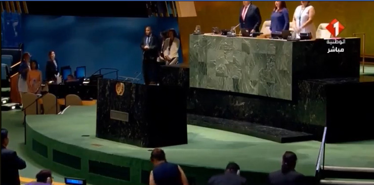 وقد تولى السفير القائم بالأعمال بالنيابة لبعثة الجمهورية التونسية لدى الأمم المتحدة إلقاء كلمة وزير الشؤون الخارجية خميس الجهيناوي باسمه و نيابة عنه بعد أن تعذر عليه التحول إلى نيويورك والالتحاق بالموكب نظرا لإلتزام السادة أعضاء الحكومة بفترة الحداد الوطني على الرئيس الراحل والتزامن هذه الجلسة مع الإجتماع الإستثنائي الذي أشرف عليه صباح اليوم وزير الشؤون الخارجية بمقر الوزراة في إطار الدورة 37 للندوة السنوية لرؤساء البعثات الدبلوماسية والدائمة والقنصلية.