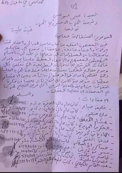 وتضم قائمة المستقيلين عضوين باللجنة المركزية للحزب و9 كتاب عامين أكّدوا على أن اعداد قائمات الترشح للانتخابات قام على أساس مصالح شخصية بحتة.
