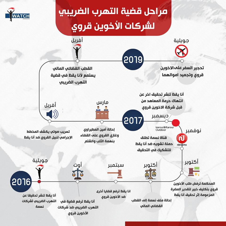 كما نشرت المنظمة مراحل القضية التي انطلقت في جويلية 2016 بعد التحقيق حول التهرب الضريبي لشركات نسمة ورفع قضايا في الغرض في أوت و سبتمبر 2016.