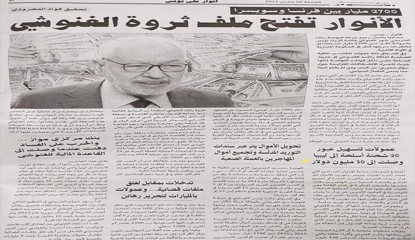 وكانت جريدة “الأنوار” قد نشرت في عددها الصادر يوم تحقيقاً تحت عنوان “الأنوار تفتح ملف ثروة الغنوشي” كشفت فيه عما قالت انها الثروة الحقيقية لرئيس حركة النهضة والبرلمان راشد الغنوشي مؤكدة ان ثروته تتمثل في ودائع ببنوك سويسرية وحصص في شركات خارج تونس قالت ان من بينها 3 شركات في فرنسا.