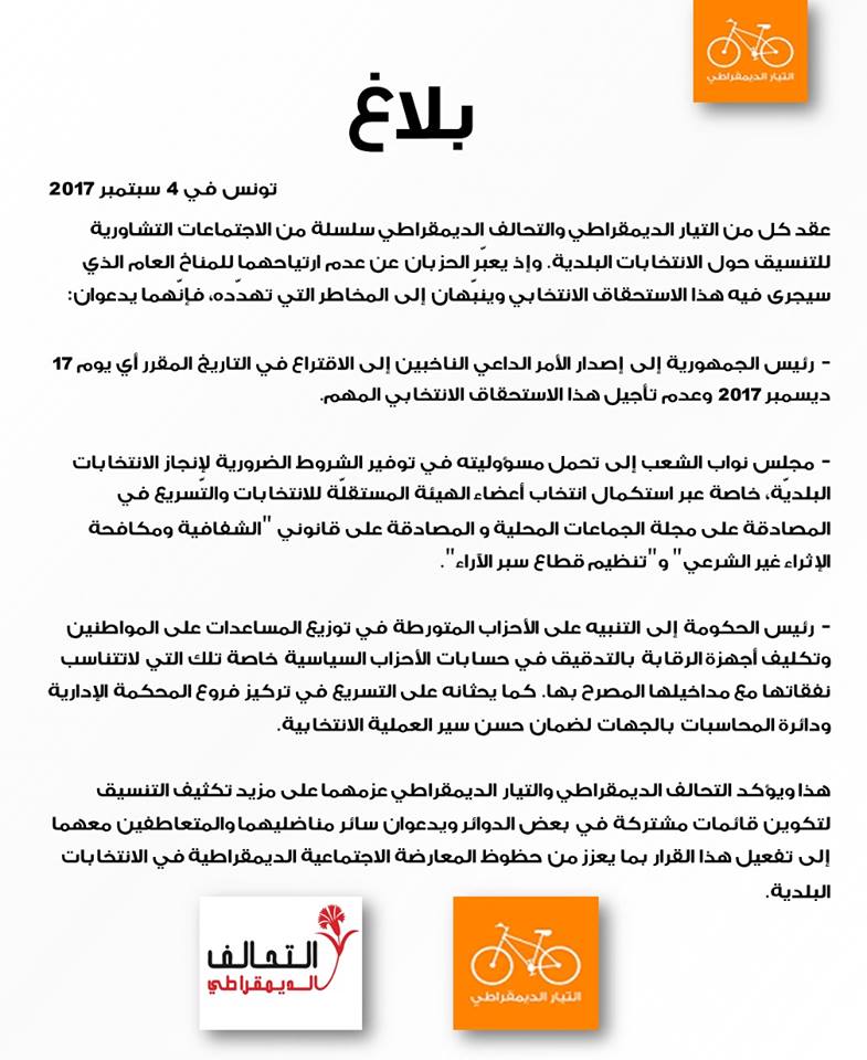 وطالب الحزبان “مجلس نواب الشعب بتحمل مسؤوليته في توفير الشروط الضرورية لإنجاز الانتخابات البلديّة، خاصة عبر استكمال انتخاب أعضاء الهيئة المستقلّة للانتخابات والتّسريع في المصادقة على مجلة الجماعات المحلية والمصادقة على قانوني “الشفافية ومكافحة الإثراء غير الشرعي وتنظيم قطاع سبر الآراء”.