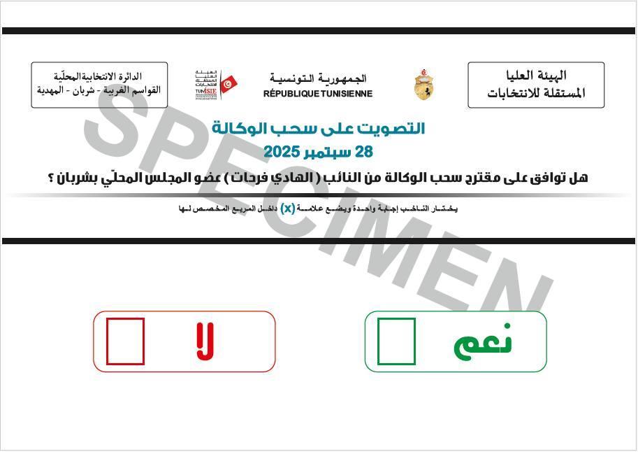 وتحمل ورقة التصويت على سحب الوكالة جملة: هل توافق على سحب الوكالة من النائب (الهادي فرحات) عضو المجلس المحلي بشربان؟ ودعوة الى وضع قاطع ومقطوع في خانة “نعم” أو “لا”.