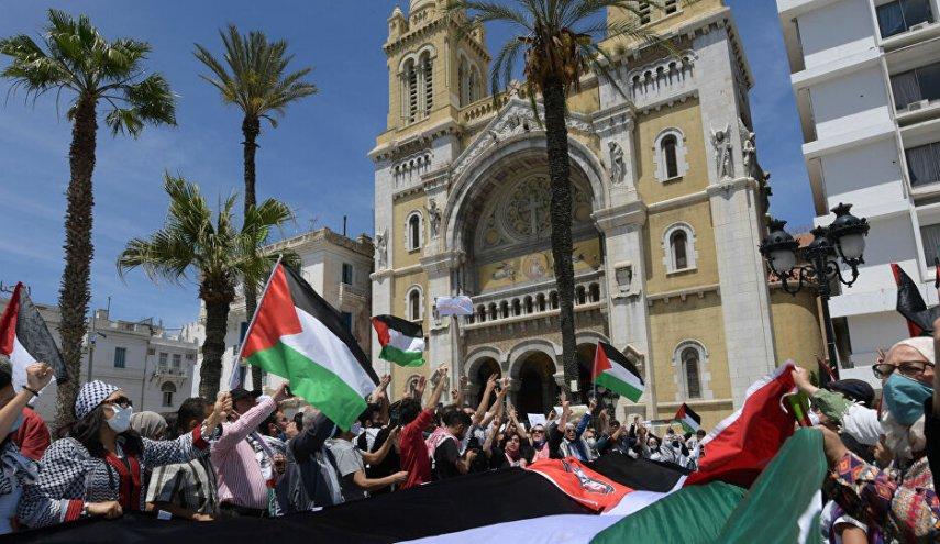 وهتف المتظاهرون بشعارات مناصرة للفلسطينيين، منها “الشعب يريد تحرير فلسطين”، داعين البرلمان إلى التسريع في سنّ قانون يجرّم التطبيع مع الإحتلال.