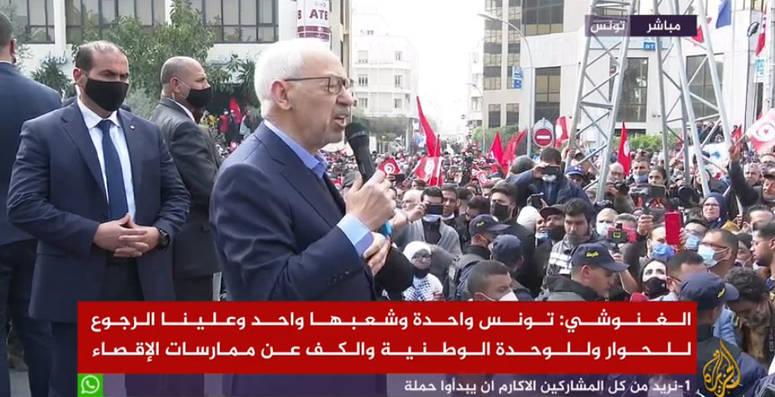 وقال الغنوشي، في كلمة ألقاها عشية اليوم السبت أمام أنصاره الذين قدموا من مختلف جهات البلاد للمشاركة في “مسيرة الثبات والدفاع عن المؤسسات” ، “إن البلاد تعبت من الأحقاد وشحن الناس لبعضهم البعض، وهي تتسع للجميع مهما كانت انتماءاتهم”،مذكرا رئيس حزب العمال حمة الهمامي، الذي ينظم بدوره مسيرة في شارع الحبيب بورقيبة بالعاصمة، بإضراب أكتوبر 2005 عندما كانت التيارات السياسية شيوعية وإسلامية تتحاور دون إقصاء ولا تفرقة.