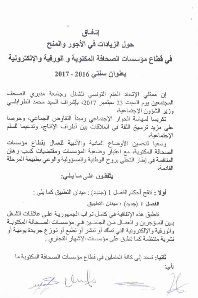 تمّ اليوم السبت 23 سبتمبر الجاري بمقر وزارة الشؤون الاجتماعية إمضاء اتفاق الزيادات في الأجور والمنح بقطاع مؤسسات الصحافة المكتوبة والورقية والالكترونية لسنتي 2016-2017.