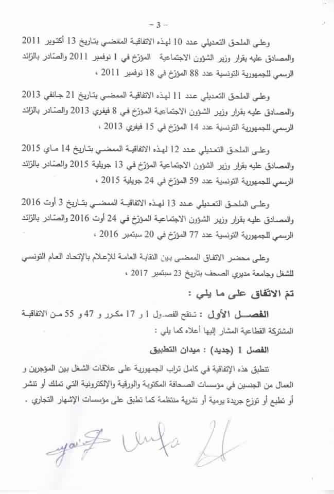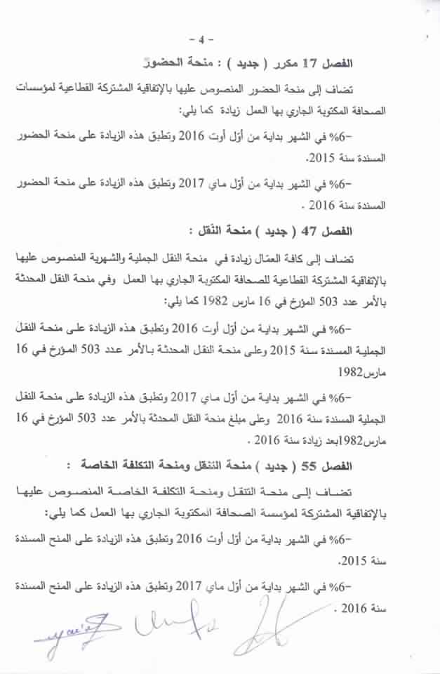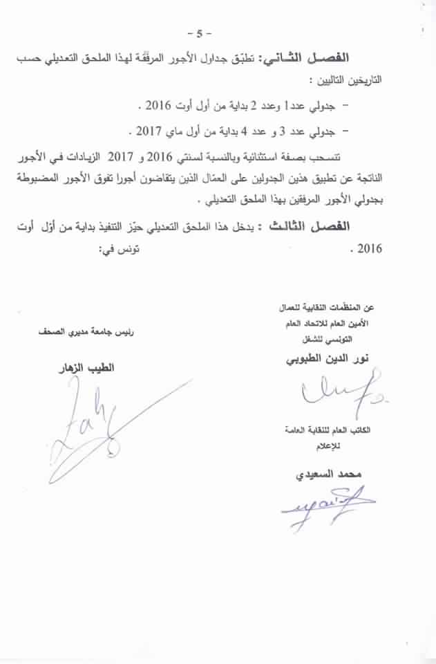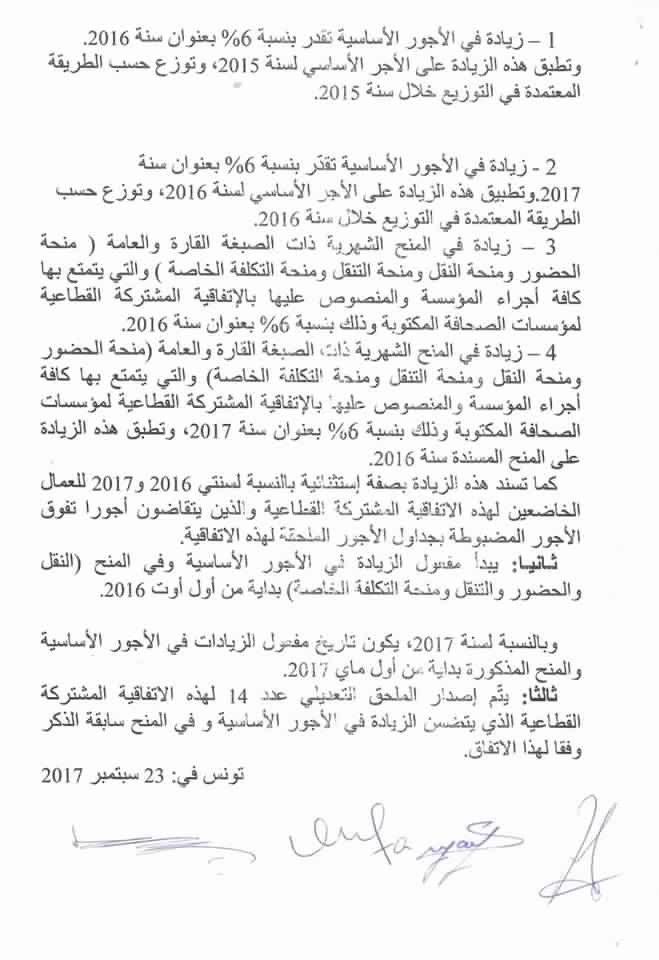 تمّ اليوم السبت 23 سبتمبر الجاري بمقر وزارة الشؤون الاجتماعية إمضاء اتفاق الزيادات في الأجور والمنح بقطاع مؤسسات الصحافة المكتوبة والورقية والالكترونية لسنتي 2016-2017.
