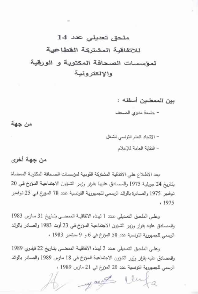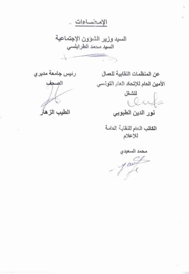 ووقّع على الاتفاق كل من وزير الشؤون الاجتماعية محمد الطرابلسي والأمين العام للاتحاد العام التونسي للشغل نور الدين الطبوبي ورئيس جامعة مديري الصحف الطيب الزهار والكاتب العام للنقابة العامة للإعلام محمد السعيدي.
