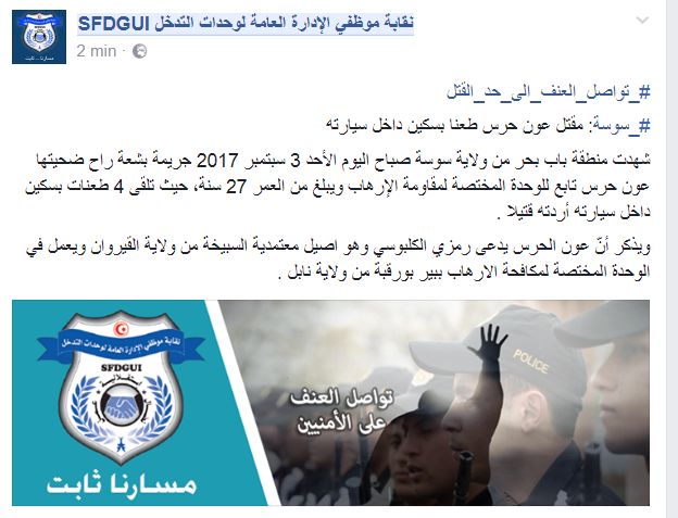اعلنت نقابة موظفي الإدارة العامة لوحدات التدخل على صفحتها الرسمية بموقع فايسبوك ، العثور فجر اليوم الاحد  على “الكومندو” رمزي الكلبوسي مقتولا داخل سيارته بطعنة سكين وسط مدينة سوسة ،وبالتحديد خلف مقر البنك المركزي .