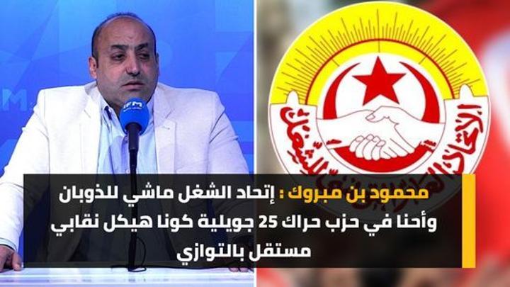 أفريقيا برس – تونس. قال الاربعاء 6 ديسمبر، الناطق الرسمي باسم حزب حراك 25 جويلية محمود بن مبروك ان اتحاد الشغل حاد عن دوره التاريخي و “ماشي للذوبان” حسب تعبيره.