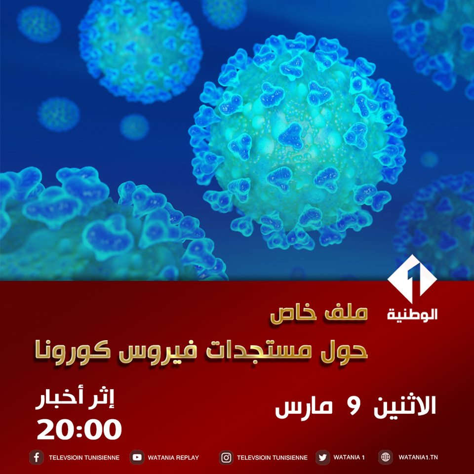 أمام انتشار فيروس كورونا و تزايد تساؤلات المواطنين حول الوقاية من هذا الفيروس ومع حرص التلفزة التونسية على تقديم المعلومة الصحيحة والإجابة على هذه الأسئلة تبث القناة الوطنية الأولى الليلة الأثنين 9 مارس مارس مباشرة اثر أخبار الثامنة ليلا ملفا خاصا حول مستجدات فيروس كورونا ” الوضع الصحي و الإجراءات الوقائية في تونس “…