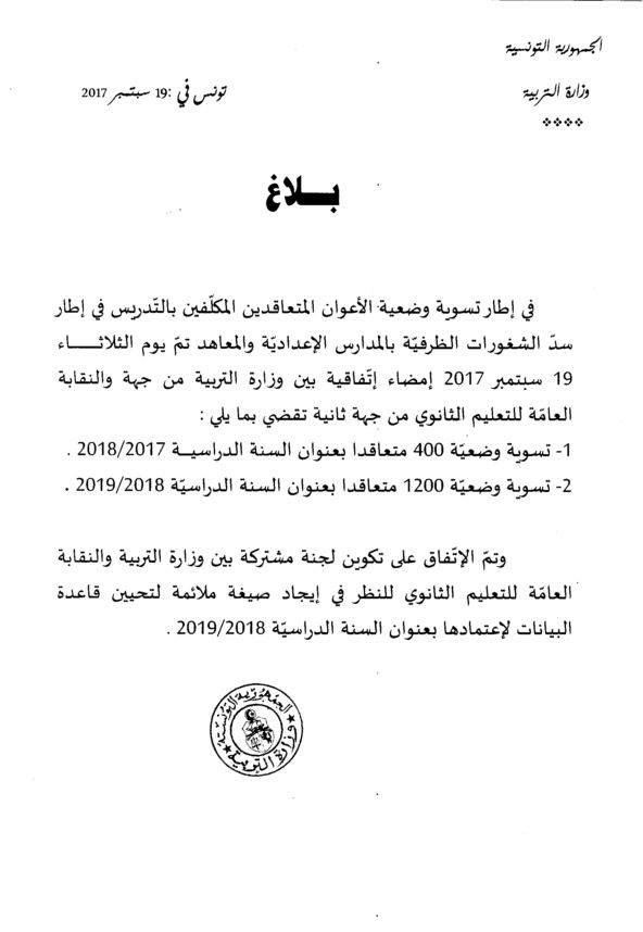 والنقابة العامة للتعليم الثانوي أفضت إلى إمضاء اتفاقية بين الطرفين تقضي بتسوية وضعية 400 متعاقد بعنوان السنة الدراسية 2017-2018 على أن يتمّ تسوية وضعية 1200 متعاقد بعنوان السنة الدراسية القادمة 2018 – 2019.
