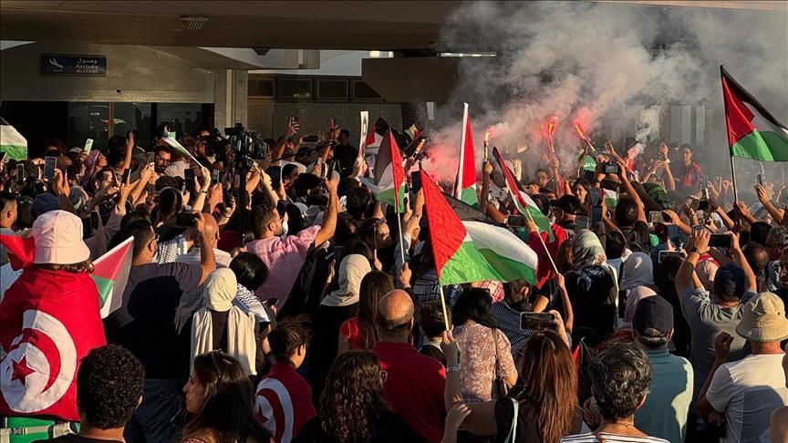وتضم الدفعة 15 ناشطا، وكان في استقبالهم مئات التونسيين الذين توافدوا إلى المطار، حاملين الأعلام التونسية والفلسطينية.