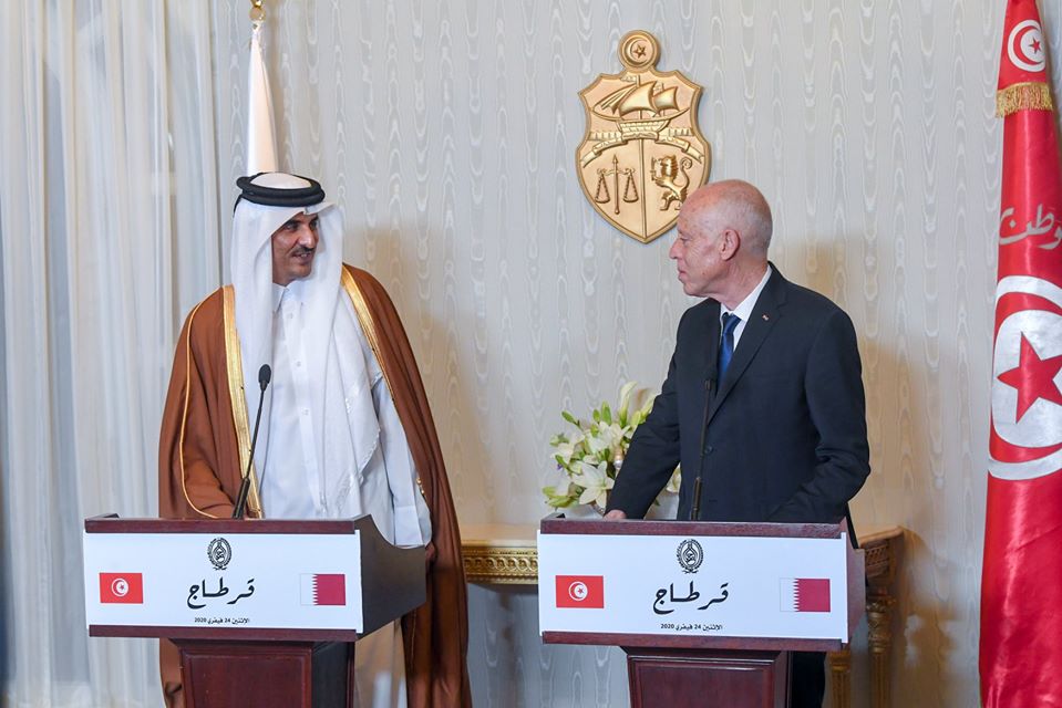 في ختام المباحثات الثنائية التي جرت بين الوفدين التونسي والقطري مساء الاثنين 24 فيفري 2020 بقصر قرطاج بمناسبة الزيارة الرسمية التي يؤديها الشيخ تميم بن حمد آل ثاني أمير دولة قطر إلى تونس يومي 24 و 25 فيفري 2020، أدلى رئيس الدولة وسمو الأمير بتصريح إعلامي مشترك أكدا خلاله على تطابق وجهات النظر بين الجانبين في العديد من القضايا الداخلية الثنائية وكذلك العربية والإقليمية وفي مقدمتها المسألة الليبية والقضية الفلسطينية.
