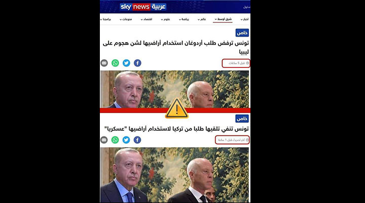 حذفت الثلاثاء 7 جانفي قناة سكاي نيوز، من موقعها الرسمي المقال الكاذب الذي جاء فيه أن المكلفة بالاعلام في رئاسة الجمهورية، رشيدة النيفر، صرحت للقناة بأن الرئيس التركي رجب طيب أردوغان وخلال زيارته الأخيرة لتونس، طلب من الرئيس قيس سعيد استخدام الأراضي التونسية لعبور القوات التركية الي ليبيا.