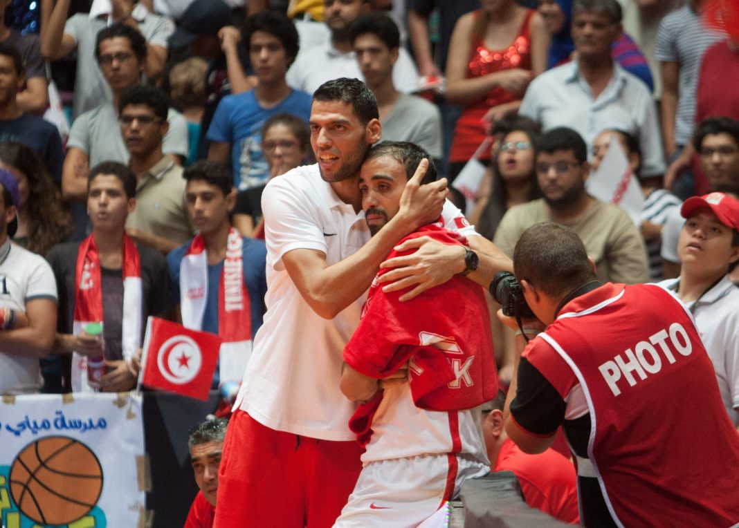 RADES, TUNISIA - AUGUST 30: Tunisia's Saleh Mejri and Makram Ben Romdhane celebrate after the 2015 FIBA Afrobasket Championship semi finals basketball match between Tunisia and Senegal at Omnisport Hall in Rades, Tunisia on August 30, 2015. (Photo by Amine Landoulsi/Anadolu Agency/Getty Images)