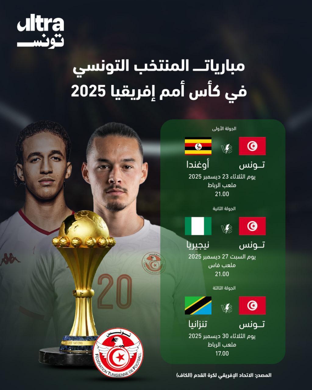 وفيما يلي، برنامج مباريات المنتخب التونسي وفق جدول مباريات كأس أمم إفريقيا 2025 الصادر عن الاتحاد الإفريقي لكرة القدم (الكاف):