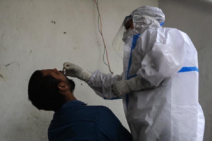 A health worker collects a swab samples for a RT-PCR COVID-19 Coronavirus test at a community centre in New Delhi on April 28, 2021. PHOTO/AFP