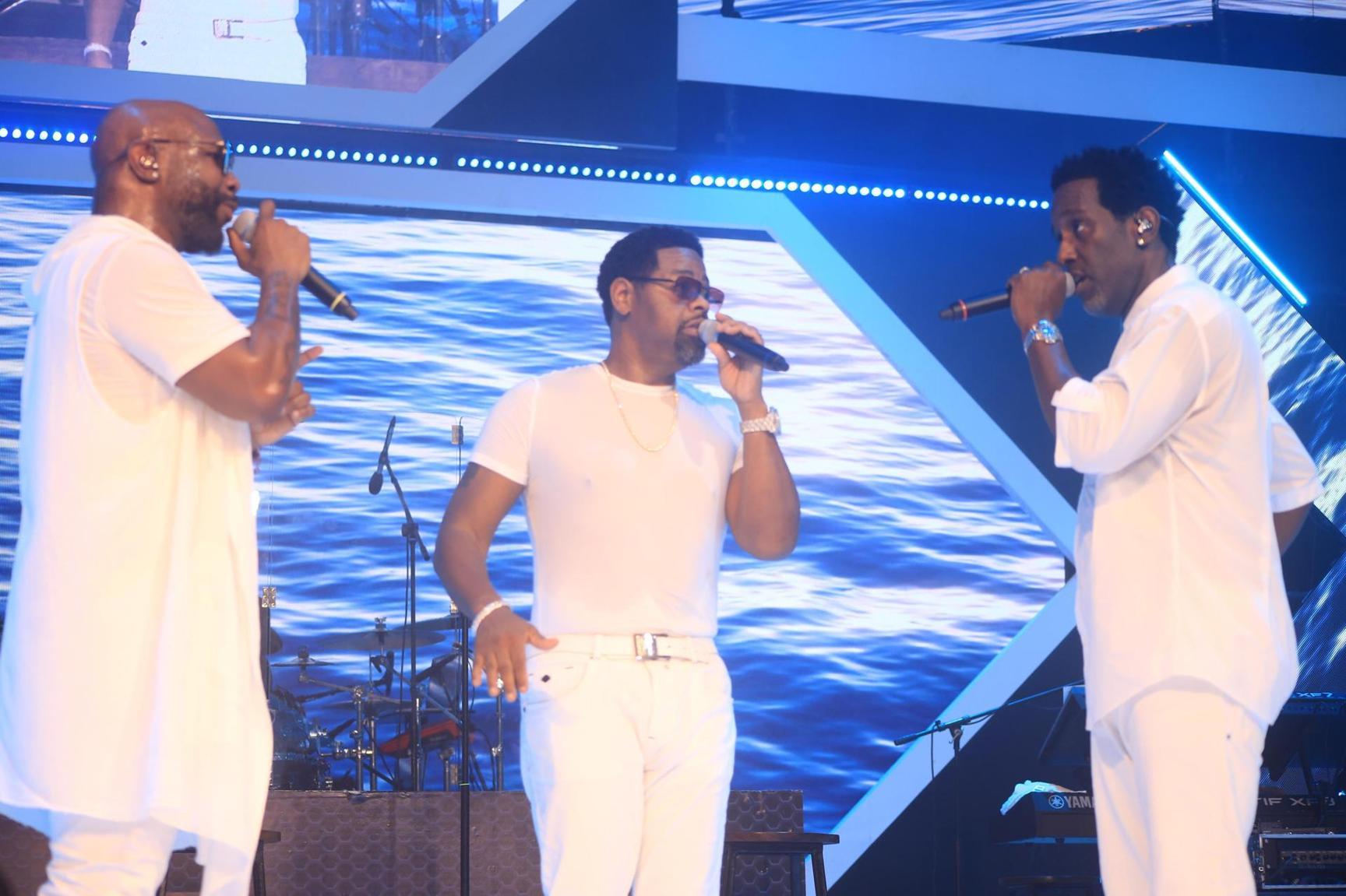 Draped in white, Shawn Stockman, Wanya Morris, and Nathan Morris, members of Boyz II Men, took to the stage at 8.40pm. After nearly 40 minutes of uncertainty, the emcee of the day, Gaetano Kaggwa, announced that Sauti Sol was coming next.