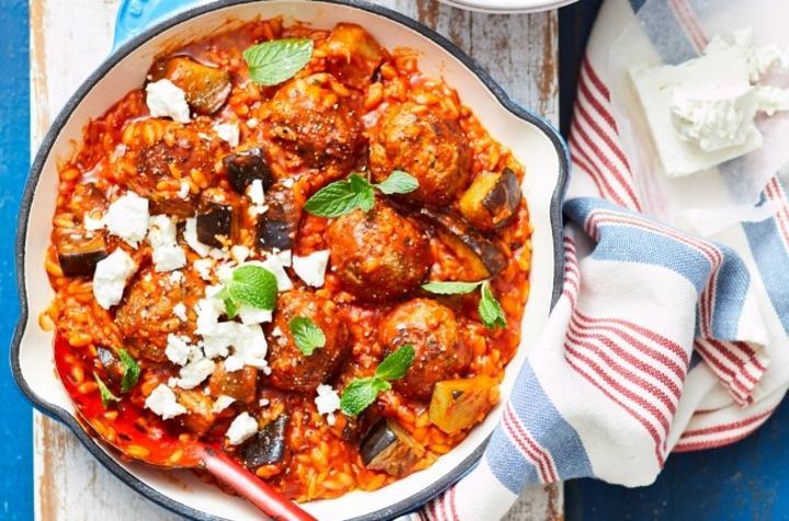 5 To serve Season the meatball mixture, top with the crumbled feta, remaining lemon rind, mint leaves and lemon wedges.