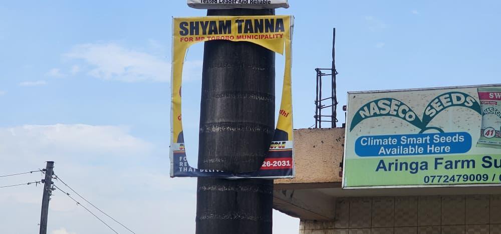 Along the stretch from the Tororo Roundabout towards the Mbale–Tororo Road, posters belonging to independent candidate Shyam Tanna have been visibly torn, with entire images shredded, mainly targeting the candidate’s face. Posters hung on electric poles have been particularly affected.