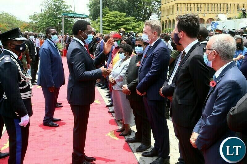 Africa-Press – Zambia. President Hakainde Hichilema interacts with Diplomats accredited to Zambia during the remembrance day of the first World War at the Cenotaph in Lusaka (2)