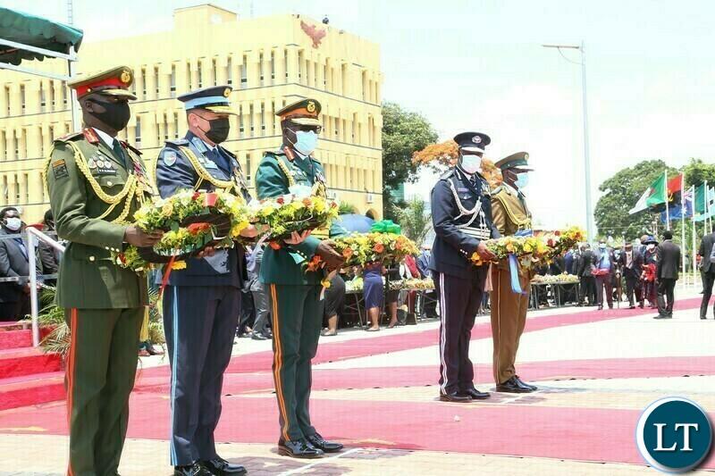 Africa-Press – Zambia. Service Chiefs laying wreaths at the cenotaph during the remembrance day of the first World War at the Cenotaph in Lusaka.