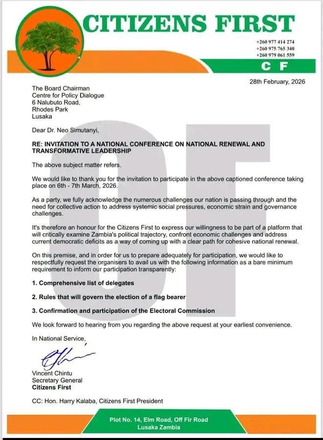 CC: Hon. Harry Kalaba, Citizens First President