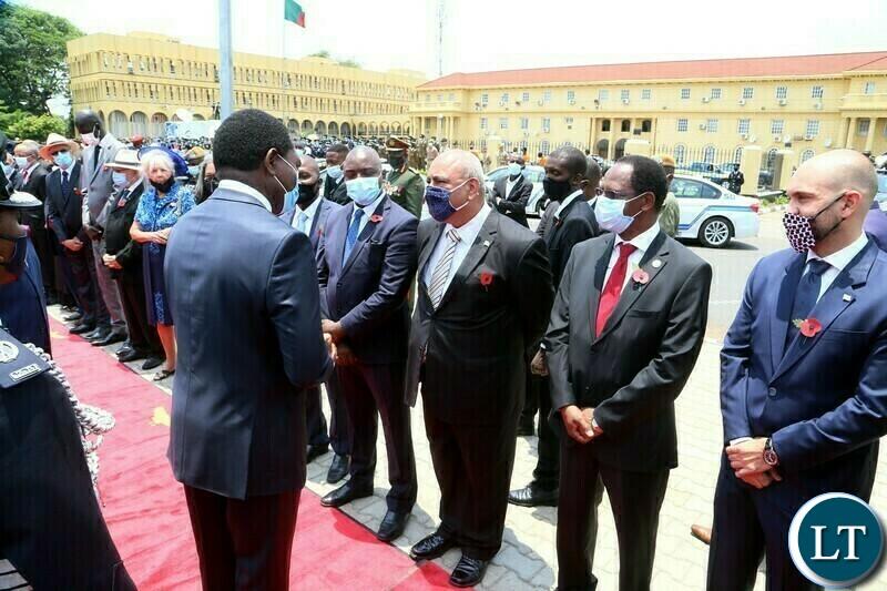 Africa-Press – Zambia. President Hakainde Hichilema interacts with Diplomats accredited to Zambia during the remembrance day of the first World War at the Cenotaph in Lusaka yesterday