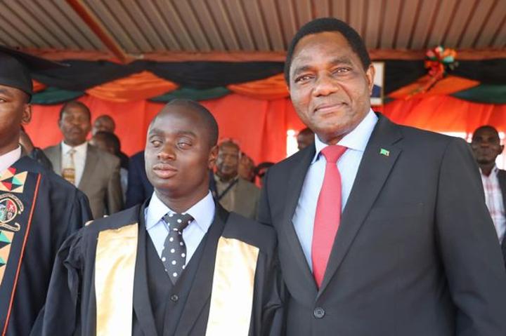 Africa-Press – Zambia. President of the Republic of Zambia Hakainde Hichilema celebrates Shadreck Zulu, whom himself and First Lady have sponsored since his childhood years, graduating with a primary school Teaching Diploma.