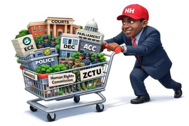 Africa-Press – Zambia. Attached to this article is an image that captures what many Zambians now feel but struggle to put into words: President Hakainde Hichilema pushing a massive shopping cart down the aisles of Zambian democracy. Inside that cart sit the Courts, the Electoral Commission of Zambia (ECZ), Parliament, the Drug Enforcement Commission (DEC), the Anti-Corruption Commission (ACC), the Police, the Army, the Human Rights Commission, and even the Zambia Congress of Trade Unions (ZCTU).