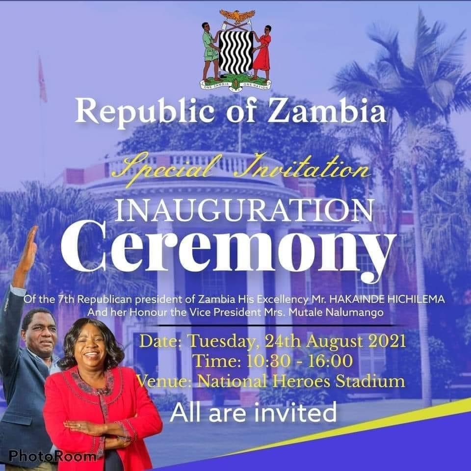 “In accordance with the Constitution of the Republic of Zambia, chapter one of the law of Zambia, government wishes to announce the inauguration of the seventh republican president His Excellency Hakainde Hichilema President-elect will take place next week on Tuesday 24th August 2021 at Heroes Stadium, commencing at 08:00. Government wishes to inform members of the public that due to Covid-19 preventive protocols; attendance of the inauguration will be by invitation. Citizens that will not be invited to attend the ceremony in person are advised to follow the proceedings of the ceremony on television, radio and online social media platforms that will be streaming the event live,” read the statement.