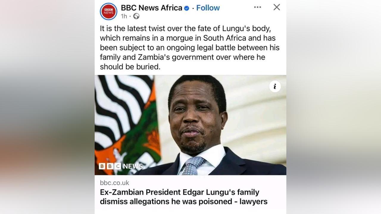 It is the latest twist over the fate of Lungu’s body, which remains in a morgue in South Africa and has been subject to an ongoing legal battle between his family and Zambia’s government over where he should be buried.