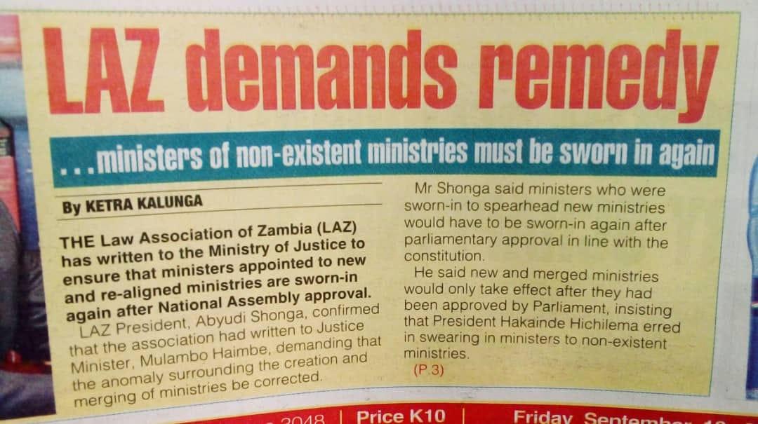 Africa-Press – Zambia. REPETITION OF OATHS: HOW DOES THE LAW GUIDE? I have been following debate around those ministers who were sworn in by the President to run government ministries not yet approved by the National Assembly but constitutionally and legally created/merged by the President to retake their oath of Office once the ministries are approved.